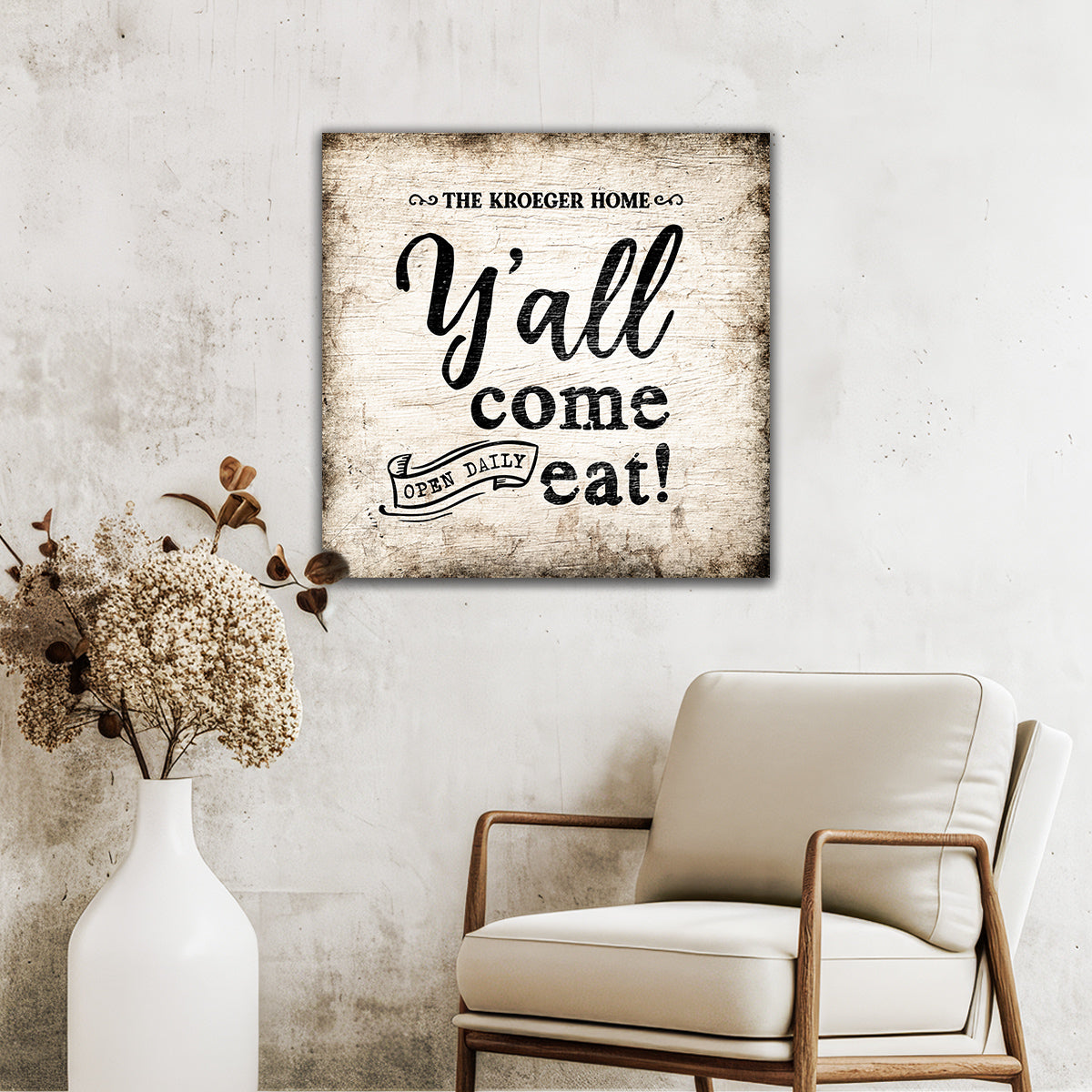 This personalized canvas wall art lets everyone know that the kitchen is open daily! Self-serve, of course! Designed to look like a distressed, farmhouse decor, this canvas wall art is sure to add a rustic touch to your home.
